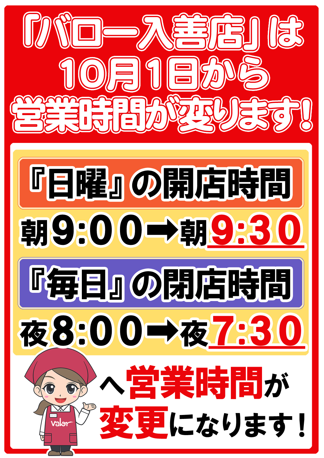 バロー入善店は「10月01日から『毎日の閉店時間が夜7:30』など営業時間が変更」